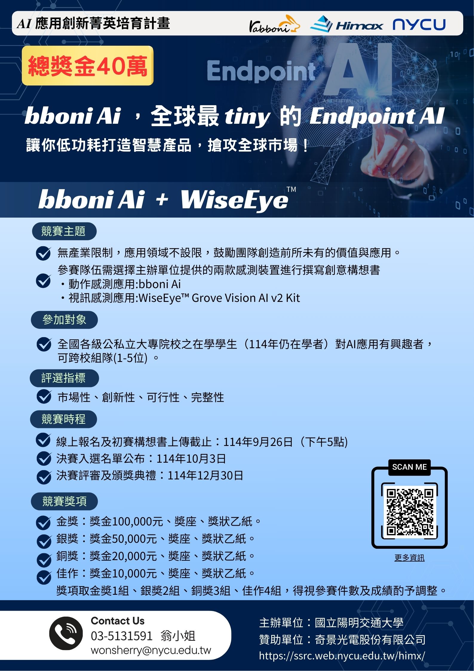 一、本競賽由國立陽明交通大學主辦,奇景光電贊助,旨在培育大專院校學生AI應用創新人才,鼓勵開發高效能、低功耗之Endpoint AI應用。